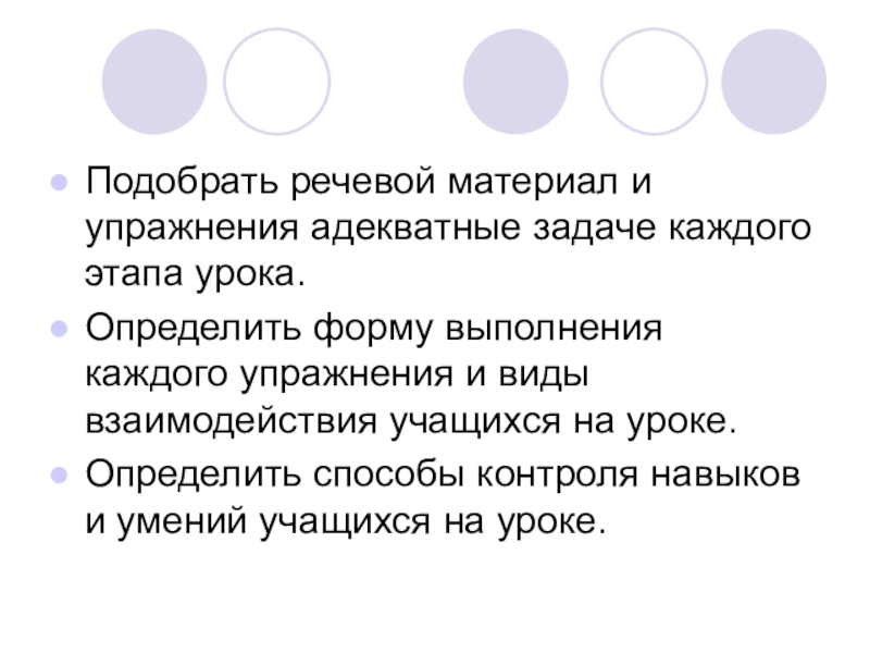 Подобрать речевой материал и упражнения адекватные задаче каждого этапа урока.