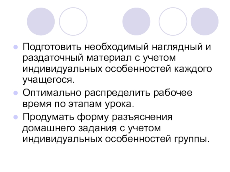 Подготовить необходимый наглядный и раздаточный материал с учетом индивидуальных особенностей каждого учащегося.Оптимально распределить рабочее время по этапам
