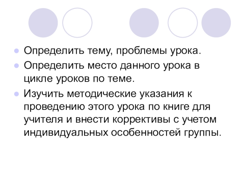 Определить тему, проблемы урока.Определить место данного урока в цикле уроков по теме.Изучить методические указания к проведению этого