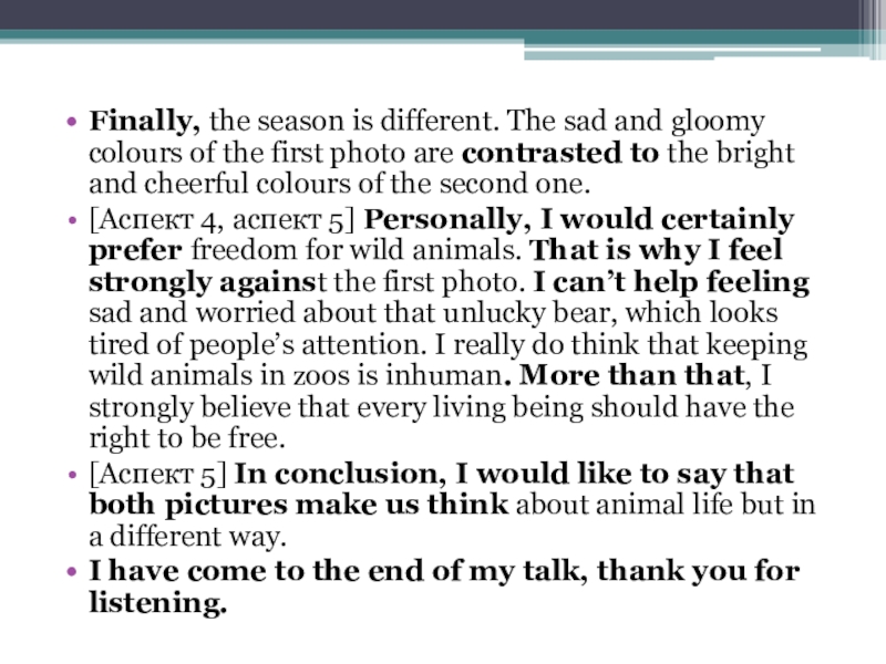 [Аспект 4, аспект 5] Personally, I would certainly prefer freedom for wild animals. That is why I feel strongly against the first photo. I can’t help feeling sad and worried about that unlucky bear, which looks tired of people’s attention. I really do think that keeping wild animals in zoos is inhuman. More than that, I strongly believe that every living being should have the right to be free.