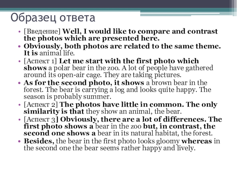 [Аспект 3] Obviously, there are a lot of differences. The first photo shows a bear in the zoo but, in contrast, the second one shows a bear in its natural habitat, the forest.