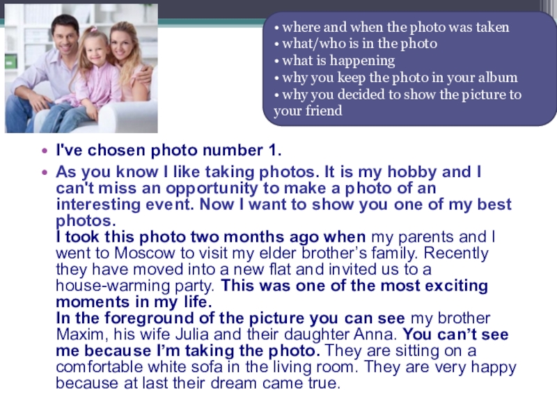 In the foreground of the picture you can see my brother Maxim, his wife Julia and their daughter Anna. You can’t see me because I’m taking the photo. They are sitting on a comfortable white sofa in the living room. They are very happy because at last their dream came true.