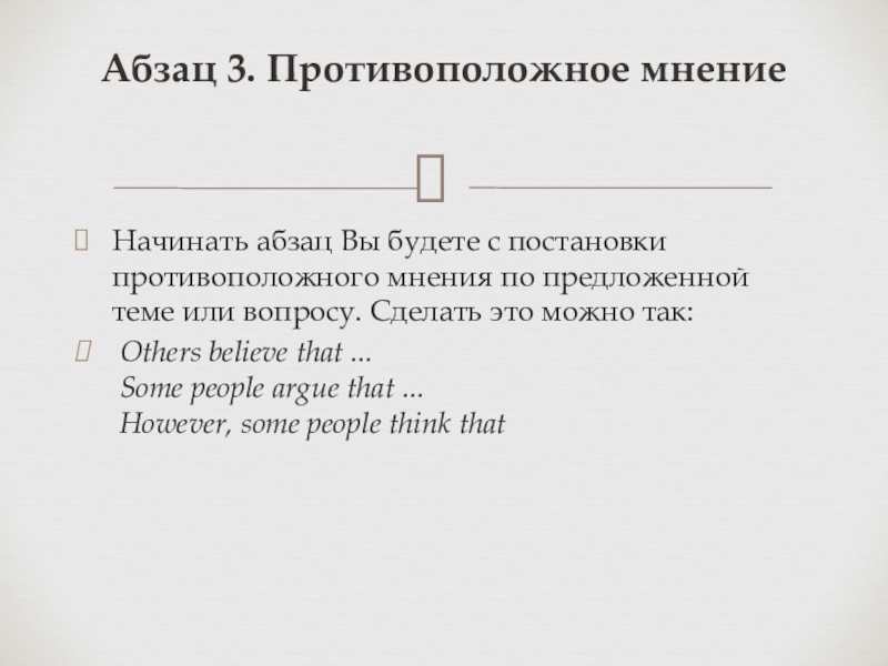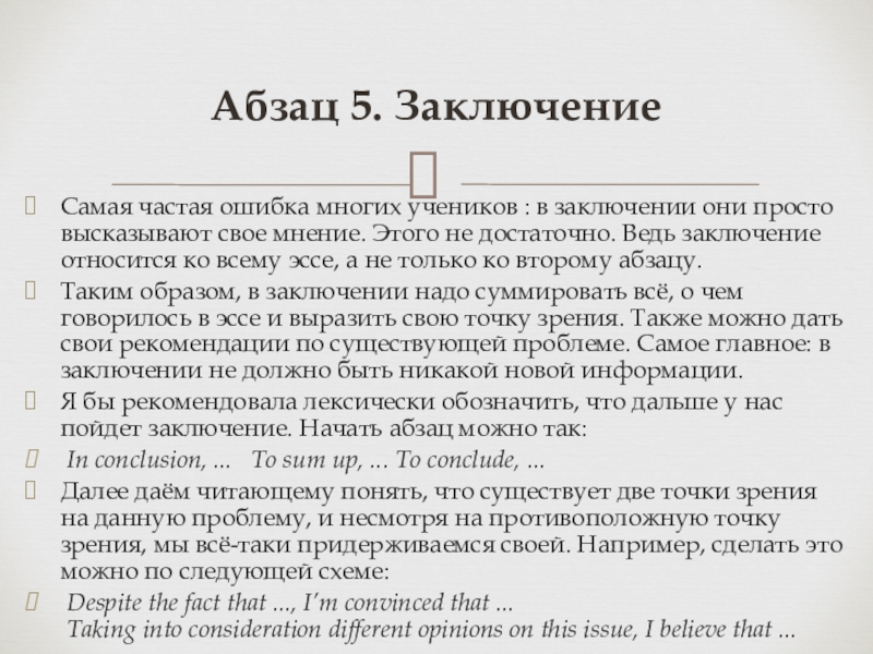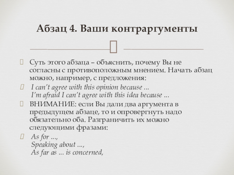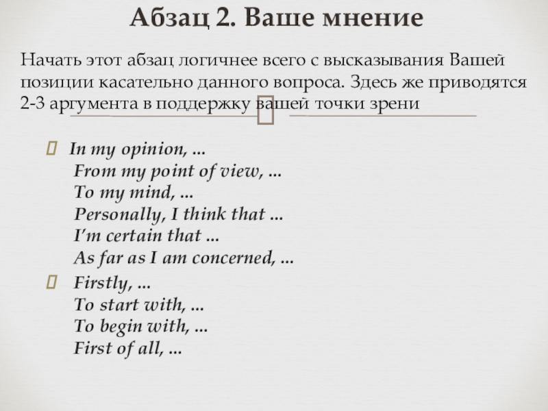 Начать этот абзац логичнее всего с высказывания Вашей позиции касательно данного вопроса. Здесь же приводятся 2-3 аргумента в поддержку вашей точки зрени