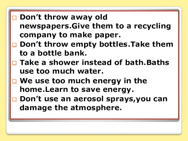 Слайд 3Don’t throw away old newspapers.Give them to a recycling company to