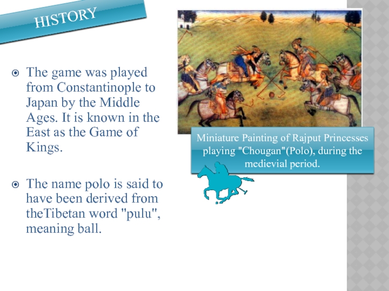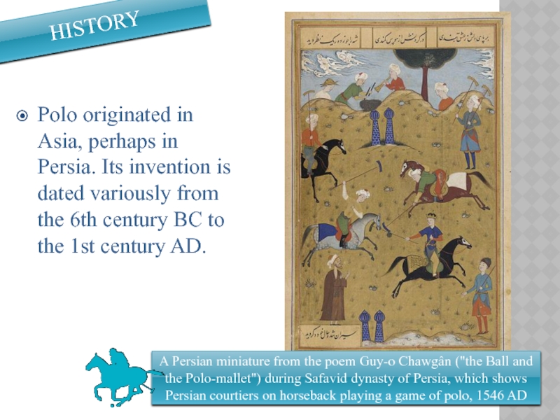A Persian miniature from the poem Guy-o Chawgân ("the Ball and the Polo-mallet") during Safavid dynasty of Persia, which shows Persian courtiers on horseback playing a game of polo, 1546 AD