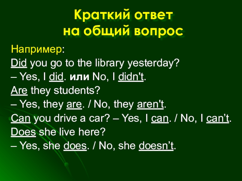 Can you drive a car? – Yes, I can. / No, I can’t.