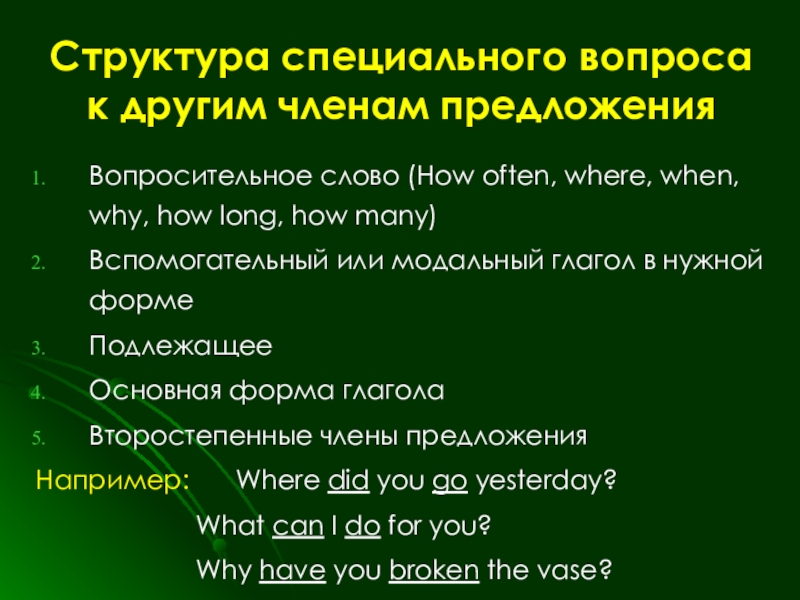 3) Второстепенные члены предложения (дополнение, обстоятельство).