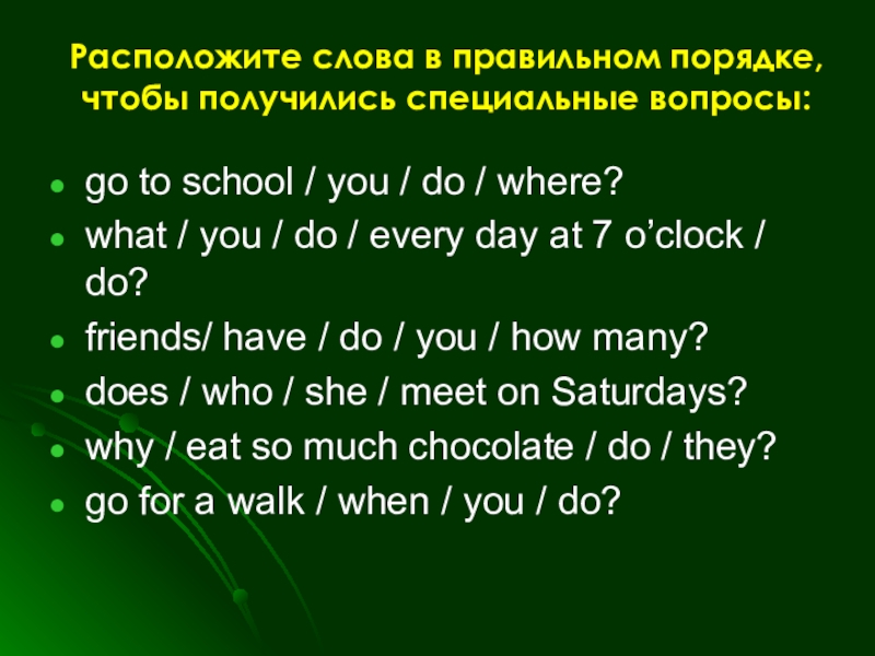 Слайд 17Расположите слова в правильном порядке, чтобы получились специальные вопросы: