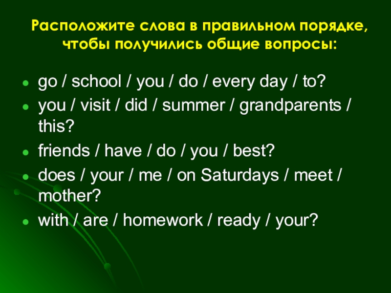 Слайд 12Расположите слова в правильном порядке, чтобы получились общие вопросы: