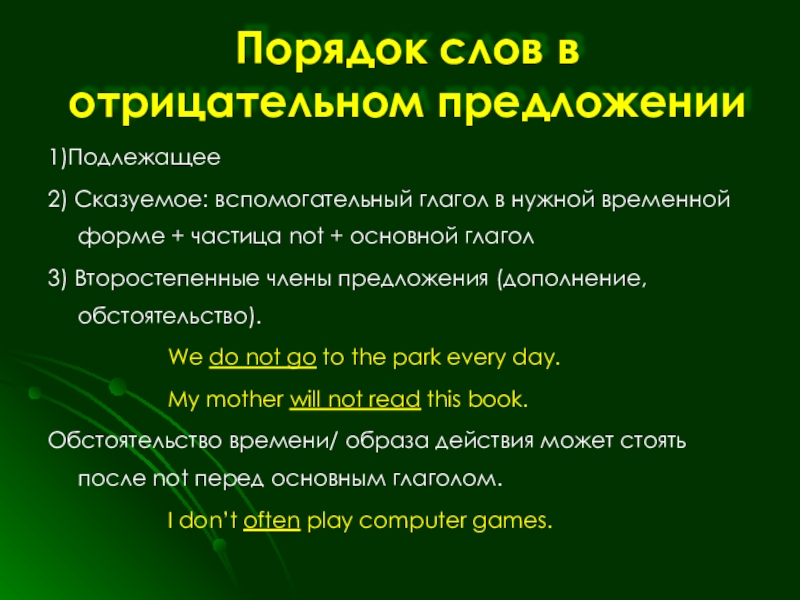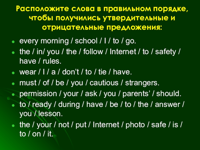 Слайд 6Расположите слова в правильном порядке, чтобы получились утвердительные и отрицательные предложения: