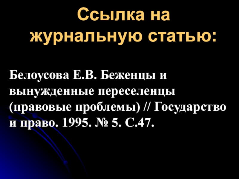 Ссылка на журнальную статью:Белоусова Е.В. Беженцы и вынужденные переселенцы (правовые проблемы) // Государство и право. 1995. №