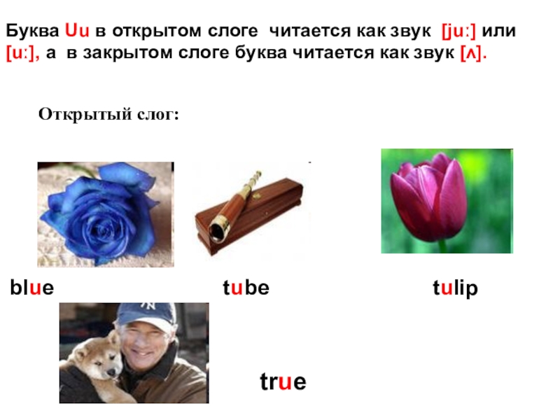 Буква Uu в открытом слоге читается как звук [juː] или [uː], а в закрытом слоге буква читается как звук [ʌ].
