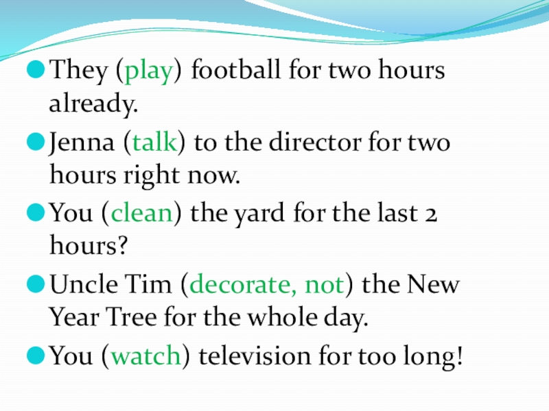 They (play) football for two hours already.Jenna (talk) to the director for two hours right now.You (clean)