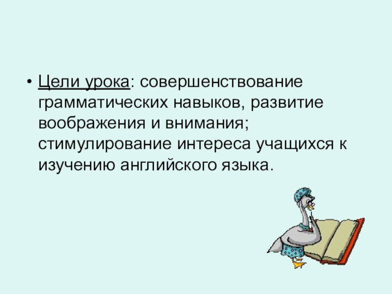 Цели урока: совершенствование грамматических навыков, развитие воображения и внимания; стимулирование интереса учащихся к изучению английского языка.
