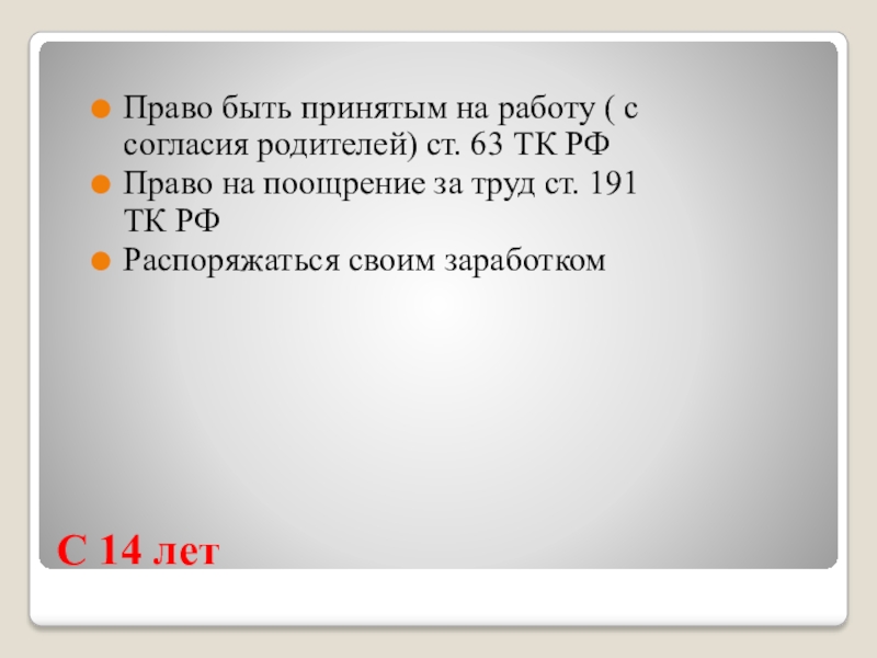 С 14 лет Право быть принятым на работу ( с согласия родителей) ст. 63 ТК РФПраво на