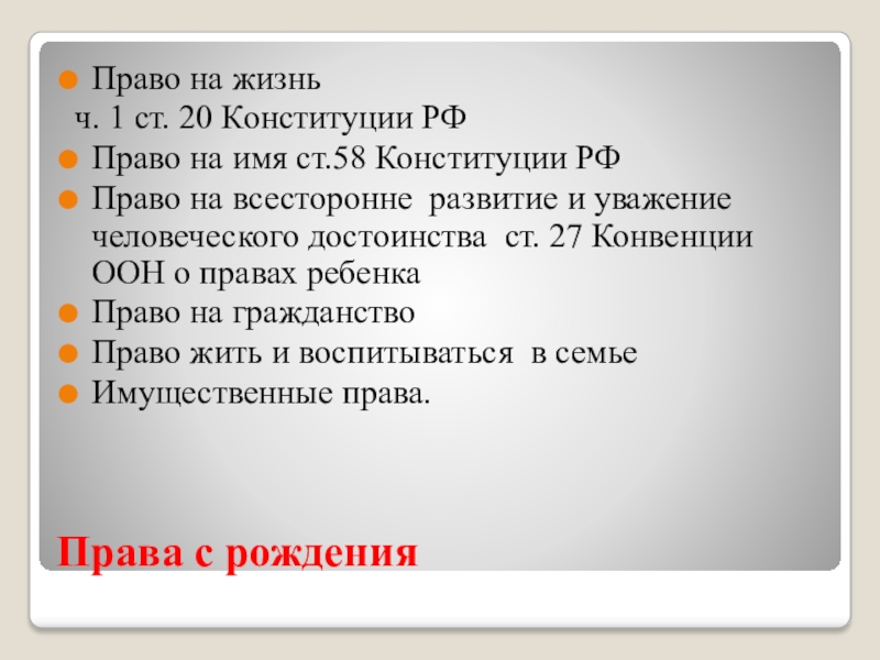 Права с рождения Право на жизнь ч. 1 ст. 20 Конституции РФПраво на имя ст.58 Конституции РФПраво