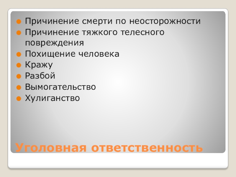 Уголовная ответственностьПричинение смерти по неосторожностиПричинение тяжкого телесного поврежденияПохищение человекаКражуРазбойВымогательствоХулиганство