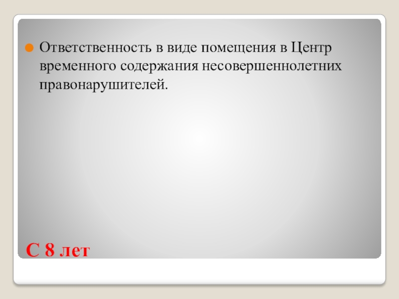 С 8 лет Ответственность в виде помещения в Центр временного содержания несовершеннолетних правонарушителей.