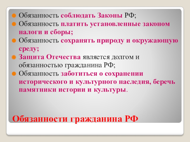 Обязанности гражданина РФОбязанность соблюдать Законы РФ;Обязанность платить установленные законом налоги и сборы;Обязанность сохранять природу и окружающую среду;Защита