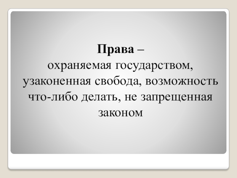 Слайд 4Права – охраняемая государством, узаконенная свобода, возможность что-либо делать, не запрещенная