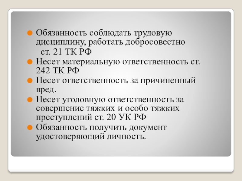 Обязанность соблюдать трудовую дисциплину, работать добросовестно   ст. 21 ТК РФНесет материальную ответственность ст. 242 ТК