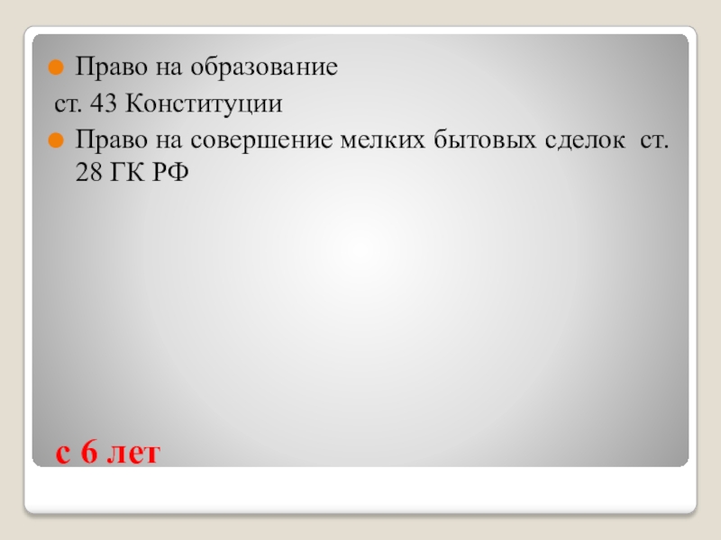 с 6 летПраво на образование ст. 43 КонституцииПраво на совершение мелких бытовых сделок ст. 28 ГК