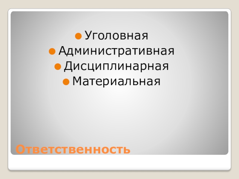 ОтветственностьУголовнаяАдминистративнаяДисциплинарнаяМатериальная