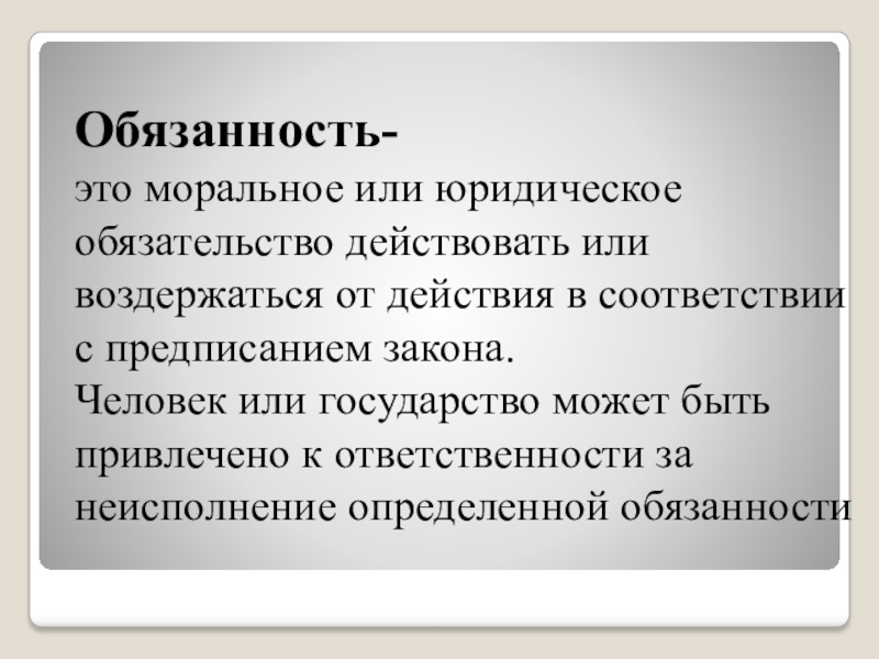Слайд 14Обязанность- это моральное или юридическое обязательство действовать или воздержаться от действия