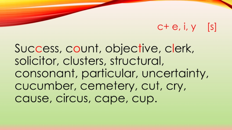 c+ e, i, y [s] Success, count, objective, clerk, solicitor, clusters, structural, consonant, particular, uncertainty, cucumber, cemetery, cut, cry, cause, circus, cape, cup.