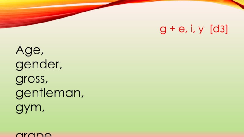 g + e, i, y [dз] Age, gender, gross, gentleman, gym,grape, game, glister, gypsy, grow, glide, gest,