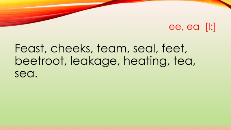 ee, ea [І:]Feast, cheeks, team, seal, feet, beetroot, leakage, heating, tea, sea.