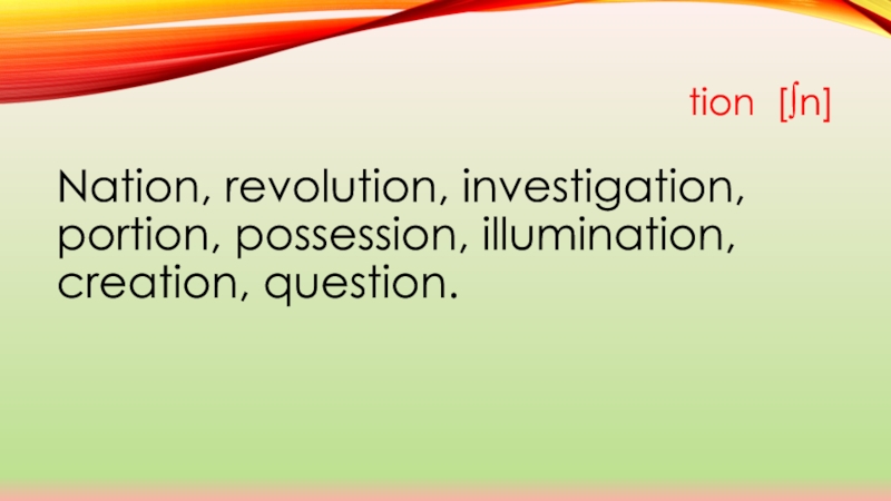 tion [∫n]  Nation, revolution, investigation, portion, possession, illumination, creation, question.