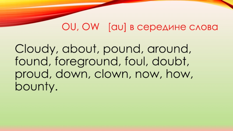 Ou, ow  [αu] в середине слова Cloudy, about, pound, around, found, foreground, foul, doubt, proud, down,