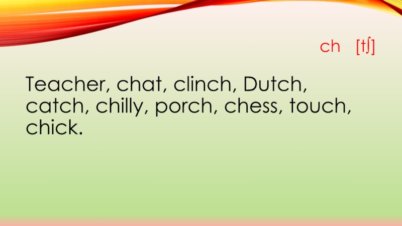 ch  [t∫]Teacher, chat, clinch, Dutch, catch, chilly, porch, chess, touch, chick.
