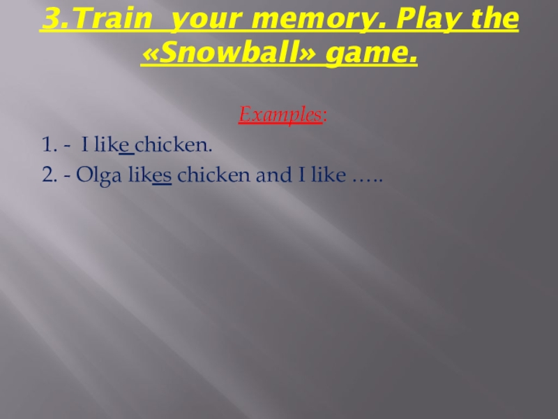 3.Train your memory. Play the «Snowball» game. Examples: 1. - I like chicken.2. - Olga likes chicken