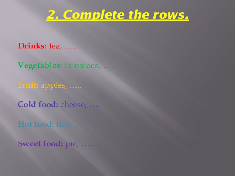 2. Complete the rows. Drinks: tea, ….. Vegetables: tomatoes, ….. Fruit: apples, ….. Cold food: cheese, …. Hot food: fish, …. Sweet
