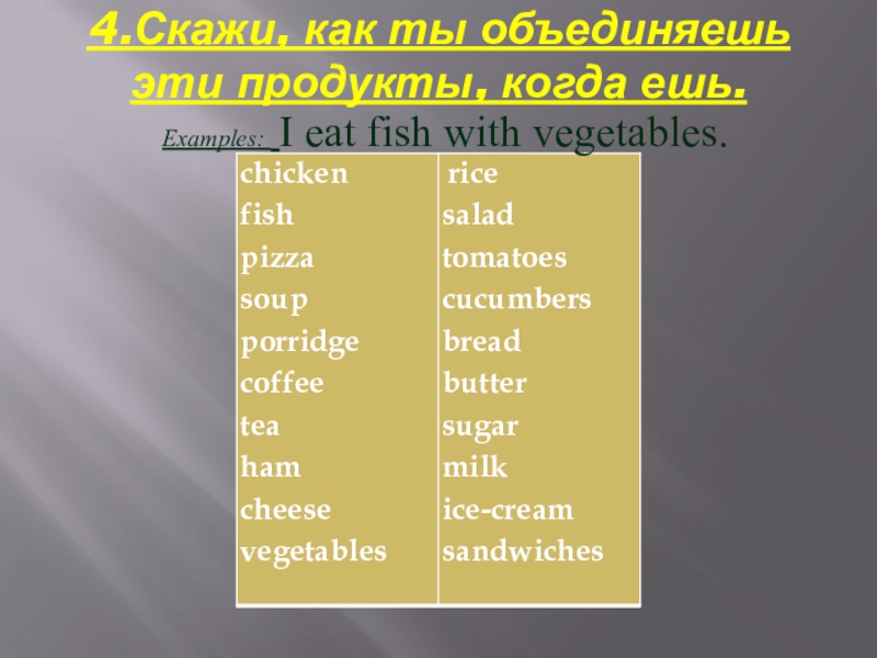4.Скажи, как ты объединяешь эти продукты, когда ешь. Examples: I eat fish with vegetables.
