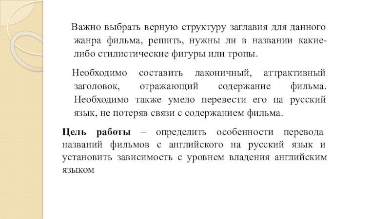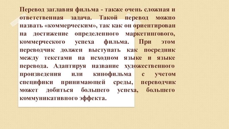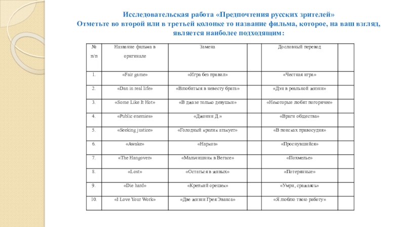 Самая простая стратегия перевода – это прямой или дословный перевод названий фильмов на русский язык, которая применяется при отсутствии непереводимых социо-культурных реалий и конфликта между формой и содержанием