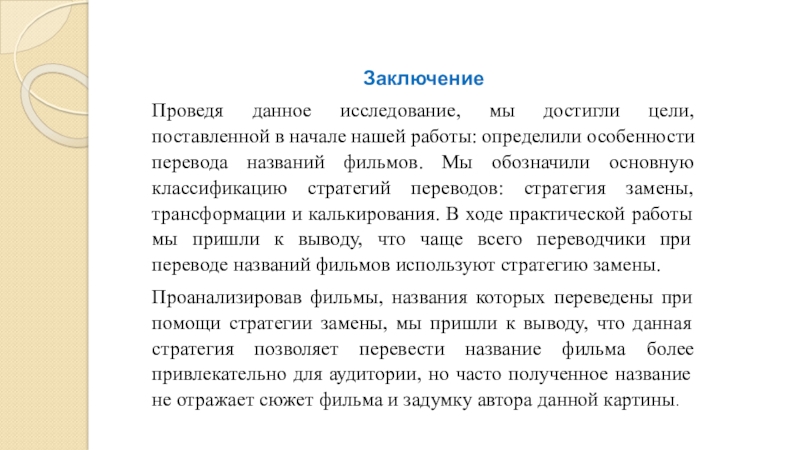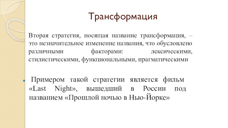 Вторая стратегия, носящая название трансформация, – это незначительное изменение названия, что обусловлено различными факторами: лексическими, стилистическими, функциональными, прагматическими