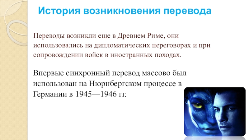 Впервые синхронный перевод массово был использован на Нюрнбергском процессе в Германии в 1945—1946 гг.