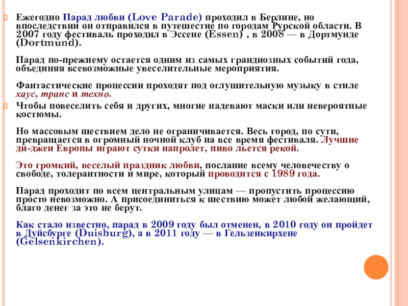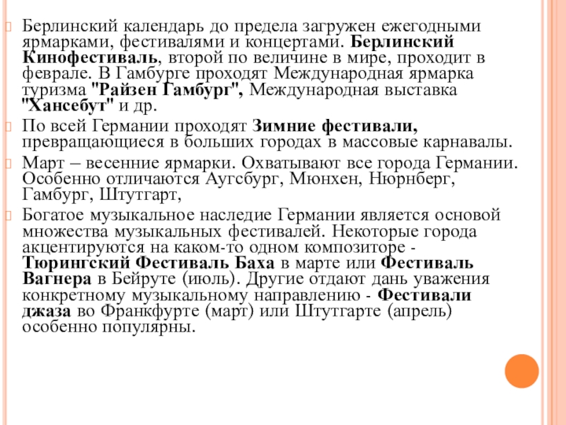 Слайд 14Берлинский календарь до предела загружен ежегодными ярмарками, фестивалями и концертами. Берлинский