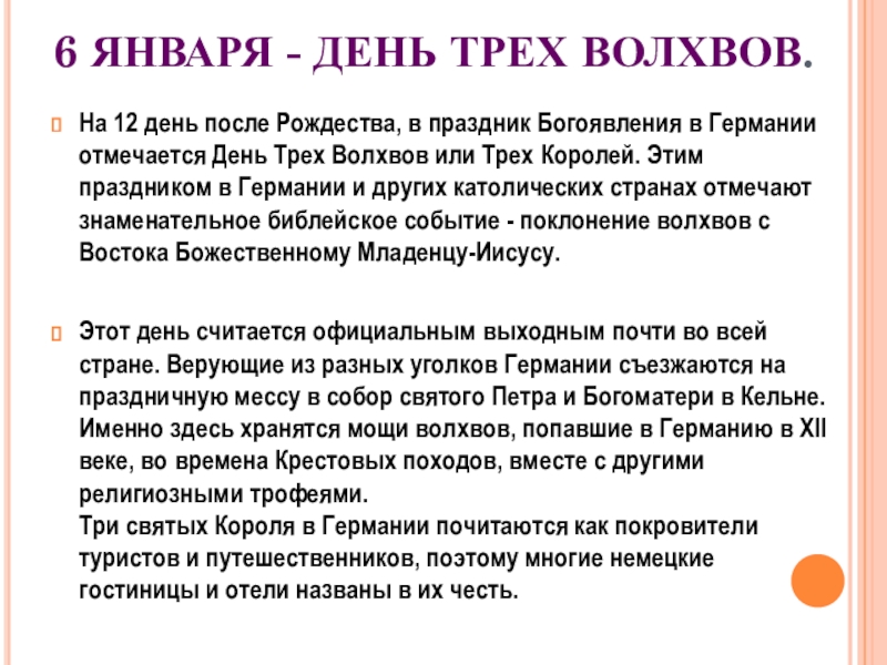 в праздник Богоявления в Германии отмечается День Трех Волхвов или Трех Королей. Этим праздником в Германии и других католических странах отмечают знаменательное библейское событие - поклонение волхвов с Востока Божественному Младенцу-Иисусу.