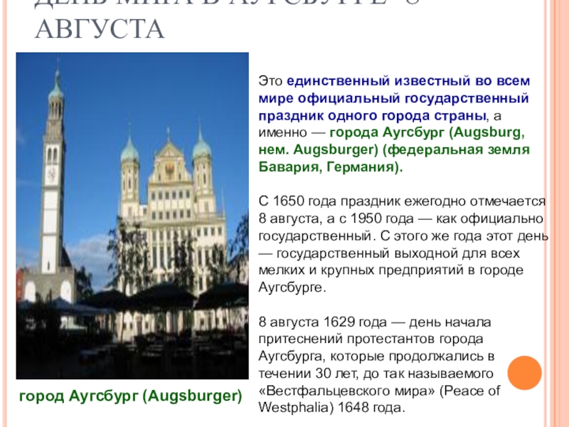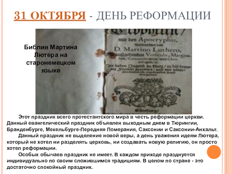 всего протестантского мира в честь реформации церкви. Данный евангелический праздник объявлен выходным днем в Тюрингии, Бранденбурге, Мекельбурге-Передняя Померания, Саксонии и Саксонии-Анхальт.