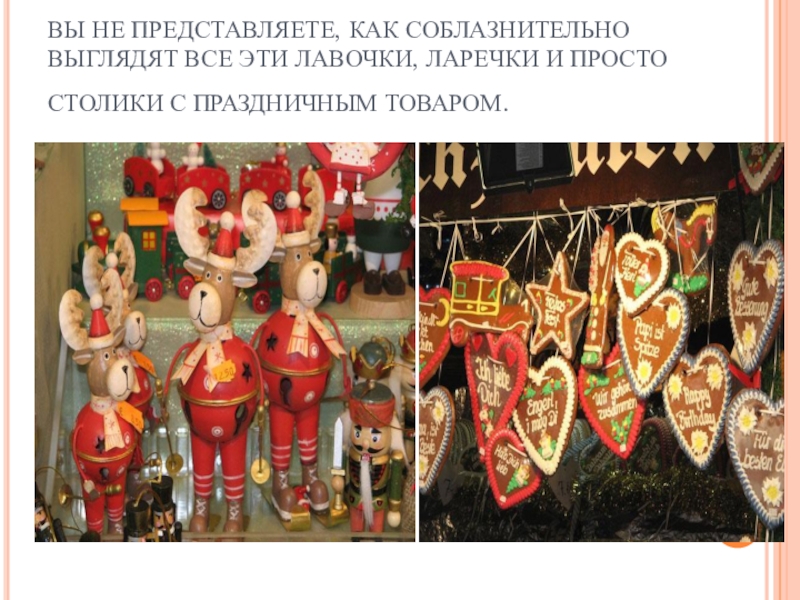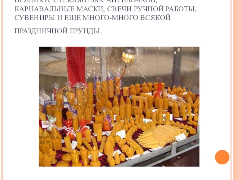 Слайд 74В НАРЯДНЫХ ЛАРЬКАХ ПРОДАЮТ АПЕЛЬСИНЫ, ПРЯНИКИ, СТЕКЛЯННЫХ АНГЕЛОЧКОВ, КАРНАВАЛЬНЫЕ МАСКИ, СВЕЧИ