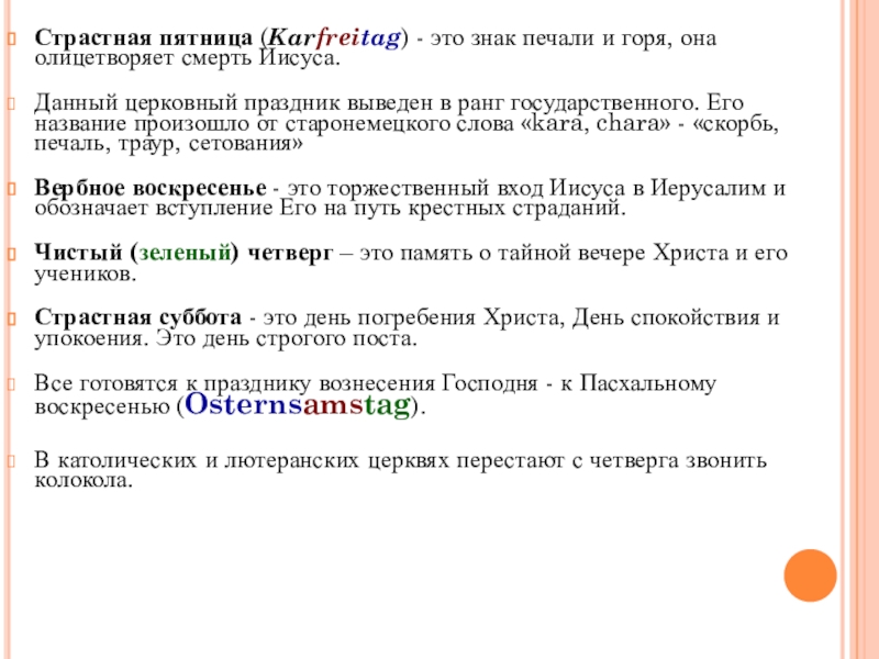 Слайд 18Страстная пятница (Karfreitag) - это знак печали и горя, она олицетворяет