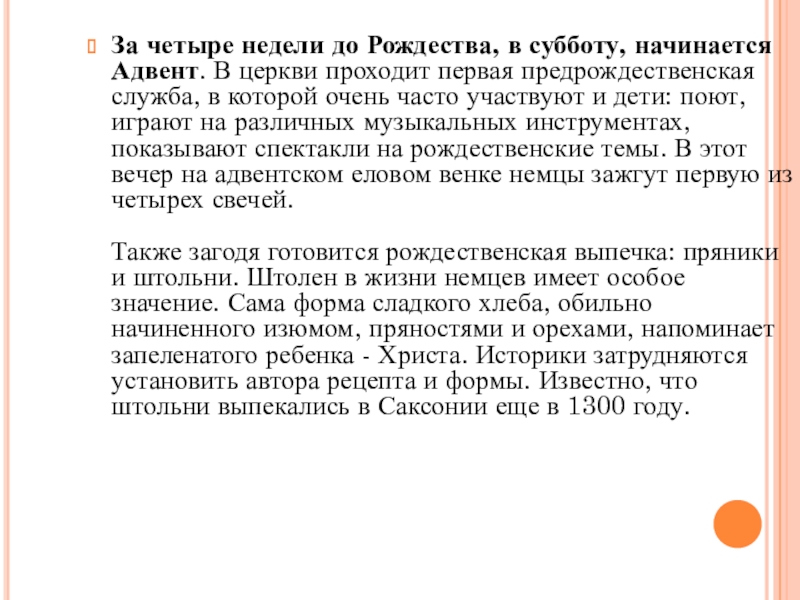 Также загодя готовится рождественская выпечка: пряники и штольни. Штолен в жизни немцев имеет особое значение. Сама форма сладкого хлеба, обильно начиненного изюмом, пряностями и орехами, напоминает запеленатого ребенка - Христа. Историки затрудняются установить автора рецепта и формы. Известно, что штольни выпекались в Саксонии еще в 1300 году.