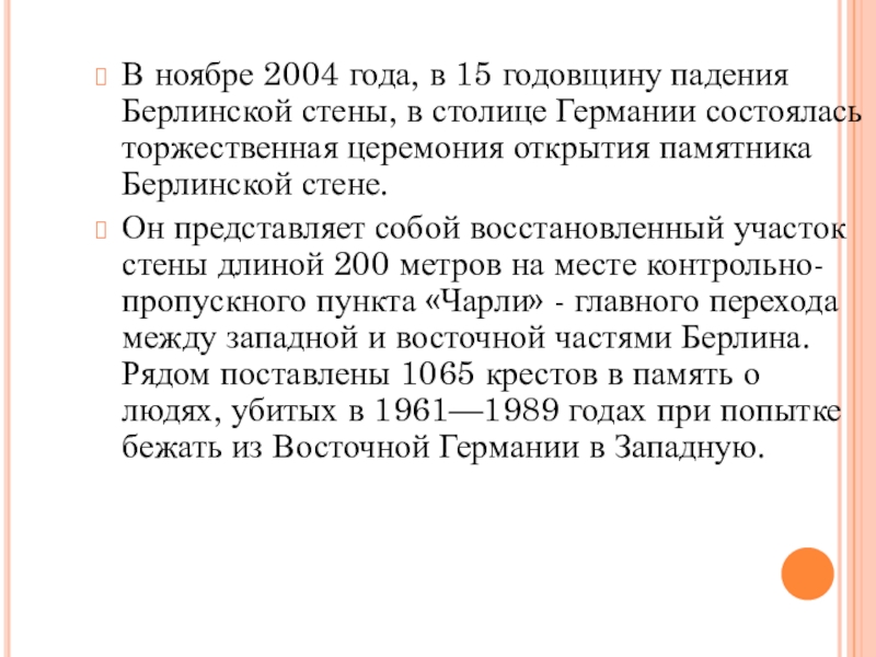 Слайд 56В ноябре 2004 года, в 15 годовщину падения Берлинской стены, в