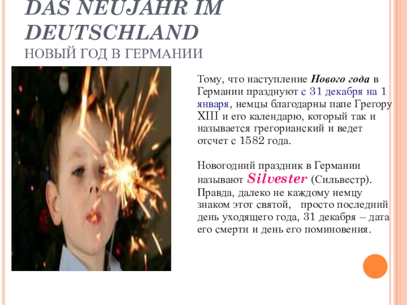 Нового года в Германии празднуют с 31 декабря на 1 января, немцы благодарны папе Грегору XIII и его календарю, который так и называется грегорианский и ведет отсчет с 1582 года.