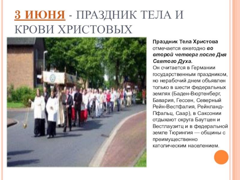 В землях Бавария, Баден-Вюртемберг, Рейнланд-Пфальц, Саар и Северный Рейн-Вестфалия этот праздник является выходным днем.