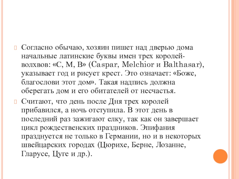 трех королей-волхвов: «С, М, В» (Caspar, Melchior и Balthasar), указывает год и рисует крест. Это означает: «Боже, благослови этот дом». Такая надпись должна оберегать дом и его обитателей от несчастья.